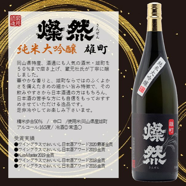 ■純米大吟醸 雄町 50%まで磨き上げた岡山特産の雄町米を使用し、蔵元杜氏が丁寧に醸しました。