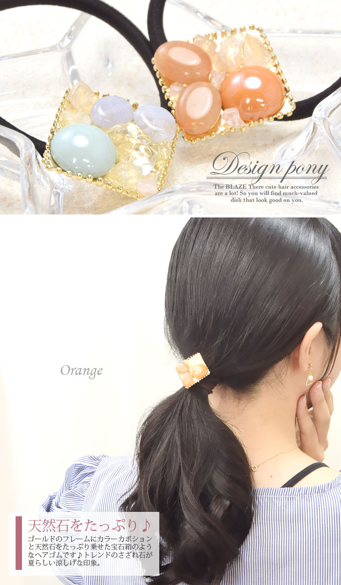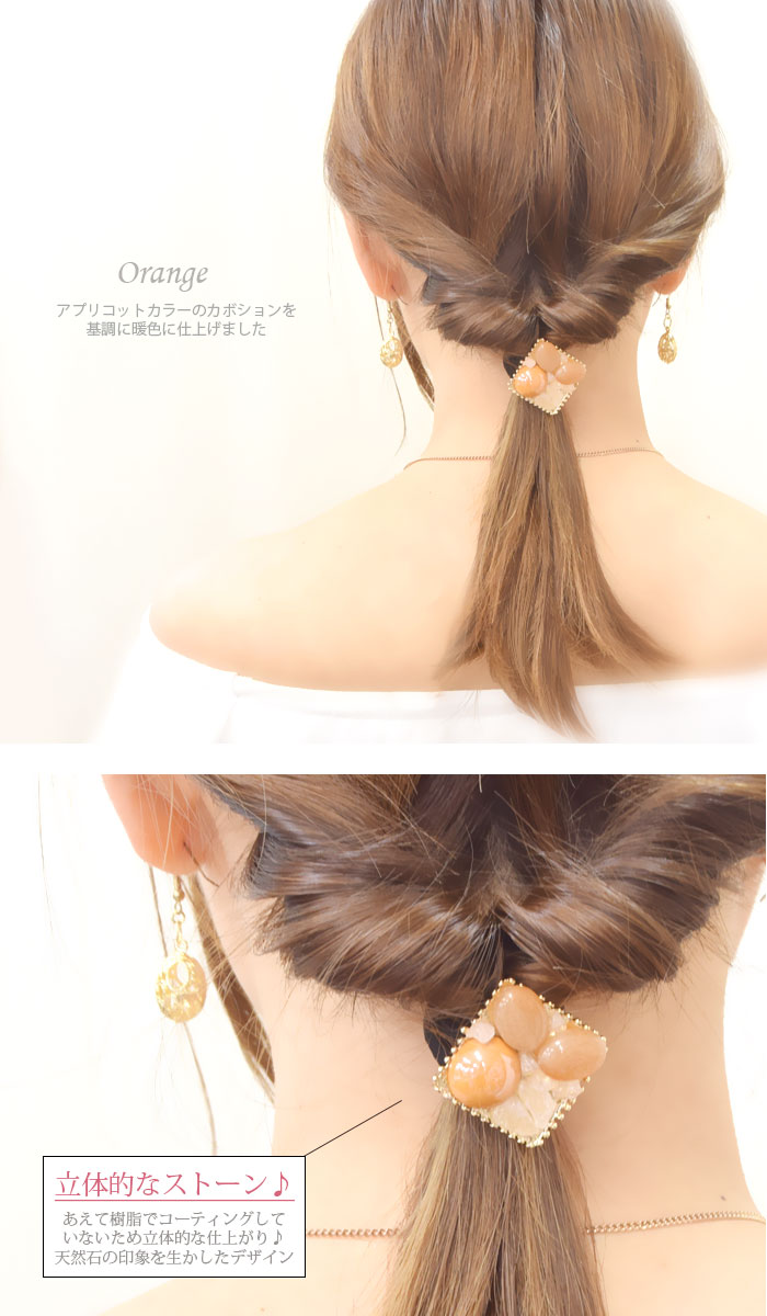 シンプルでおしゃれなデザインなのでサッと結ぶだけで簡単にイマドキヘアスタイルに! サイズ ゴム全長:約16cm モチーフ部分:約2.8×2.8cm デザイン ライトブルー系 ・ オレンジ系 入数 1個入り 材質 天然石・天然ゴム・スチール・アクリル 原産国 日本 知っておいて頂きたいこと ▼ハンドメイド商品のためパーツの形やサイズに個体差がある場合がございます。