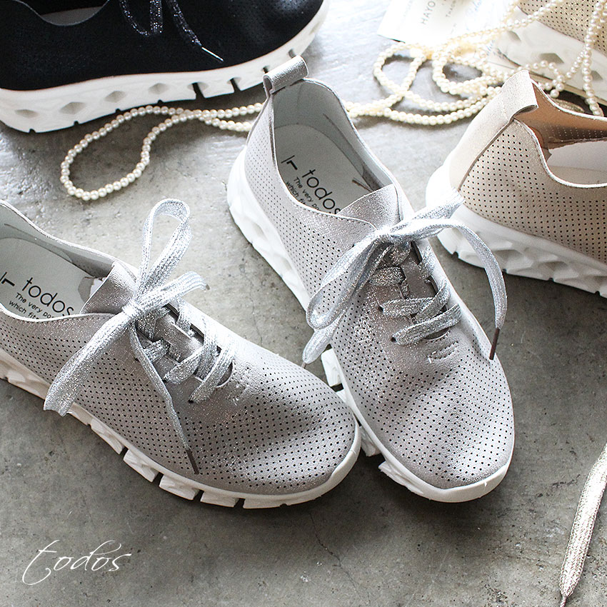 《限定クーポン配布 1/28 9:59迄》スニーカー ラメ 軽量 レディース おしゃれ きれいめ きらきら 厚底 シューズ 靴 美脚 かわいい 履きやすい 歩きやすい 走れる 軽い 柔らかい クッション シルバー ゴールド 屈曲 レースアップ 黒 TODOS トドス TO-318